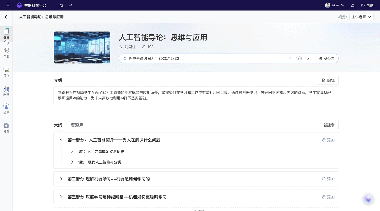 内容设计:构建AI技术的认知底层逻辑。从AI发展史到前沿大模型技术,课程覆盖基础理论、算法原理与工程实现,逐层拆解AI技术发展的必然性与局限性,帮助学生建立全链条认知框架。