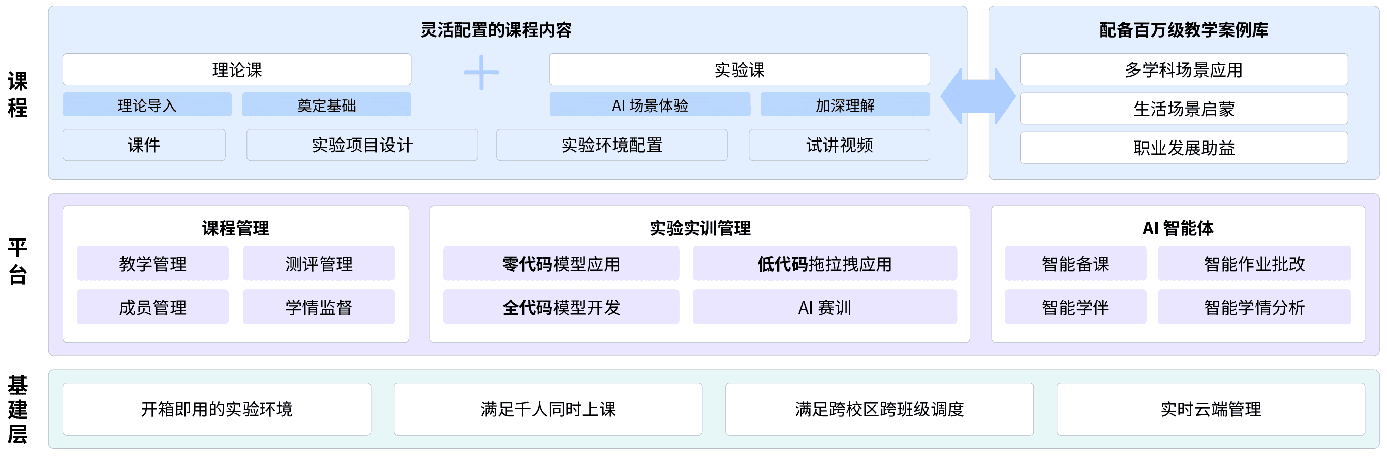 自研人工智能通识系列课程,采用分层设计理念,提供从技术原理到场景应用的差异化教学路径,让理工科学生夯实技术根基、让人文社科学生掌握人工智能思维,助力高校实现“千人千面”的人工智能通识教育。